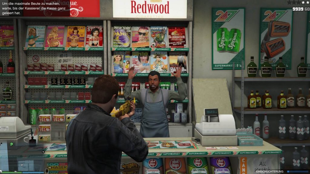 If you're on your way from point A to B and still need some cash, keep an eye out for a store on the minimap. Park your getaway car in front of the door, go inside and point the gun at the seller; if you're patient, you can quickly get a few thousand GTA $ there, which you can use to pay for gear for your next mission.